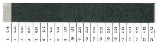 The Density Tablet is an 8″ X 1″ X-Ray Film Strip divided into 21 progressive density steps. The value of the least dense step is in the range of. 15 and the value of the densest step is in the range of 5.00