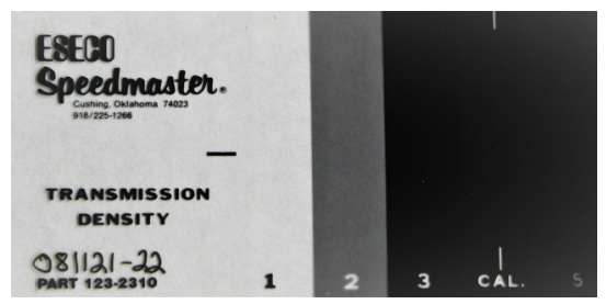 The Density Tablet is a 4″ X 2″ X-Ray Fim Strip divided into 5 progressive density steps. The value of the least dense step is in the range of .08 and the value of the densest step is in the range of 4.00