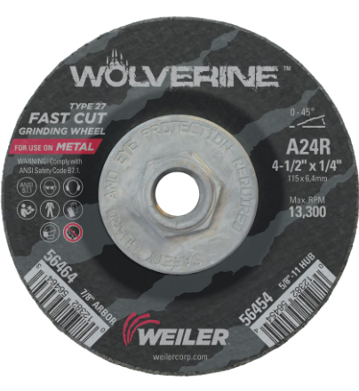 Be the first to review “Wolverine® Grinding Wheel, 4-1/2 in dia x 5/8 in-11 UNC Arbor x 1/4 in Thick, AO, 24R (10/Bx)”